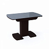 Недорогая функциональная и стильная модель. Каркас стола изготовлен из ЛДСП, цвет белый или венге. Столешница из МДФ с закаленным стеклом, матовым или глянцевым на выбор. Имеет полуовальную форму, размер 110 см с возможностью увеличения еще на 30 см. Опирается на одну ножку, переходящую в две плоские опоры на полу.
