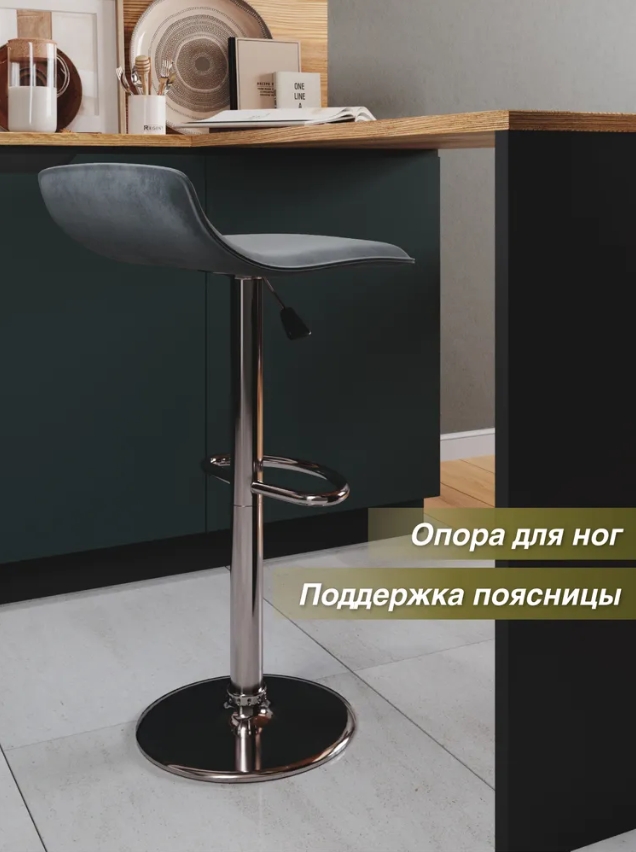 Сиденье барного стула вращается на 360 градусов и выполнено из велюра серого цвета.